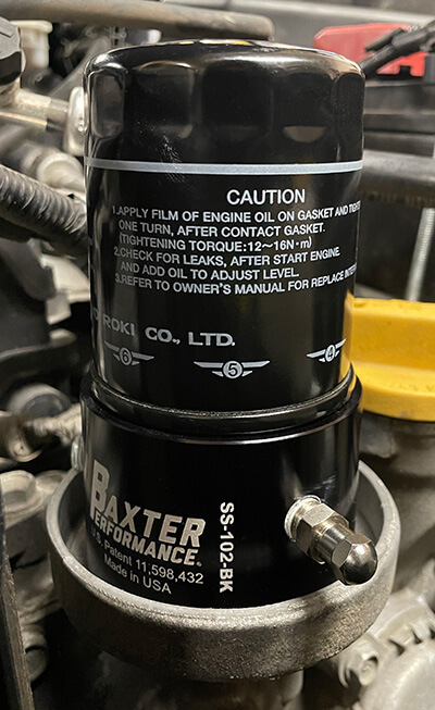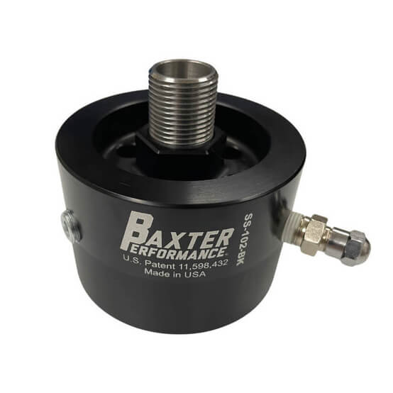 Baxter's patented anti-drain oil filter adapter contains an out-flow check valve that prevents air from migrating into the oil feed galley from the filter. The adapter installs between your block and the oil filter on Subaru FA and FB engines. Its internal check valve prevents oil from draining back into the pan after shutdown, keeping the filter and upper oil passages full.